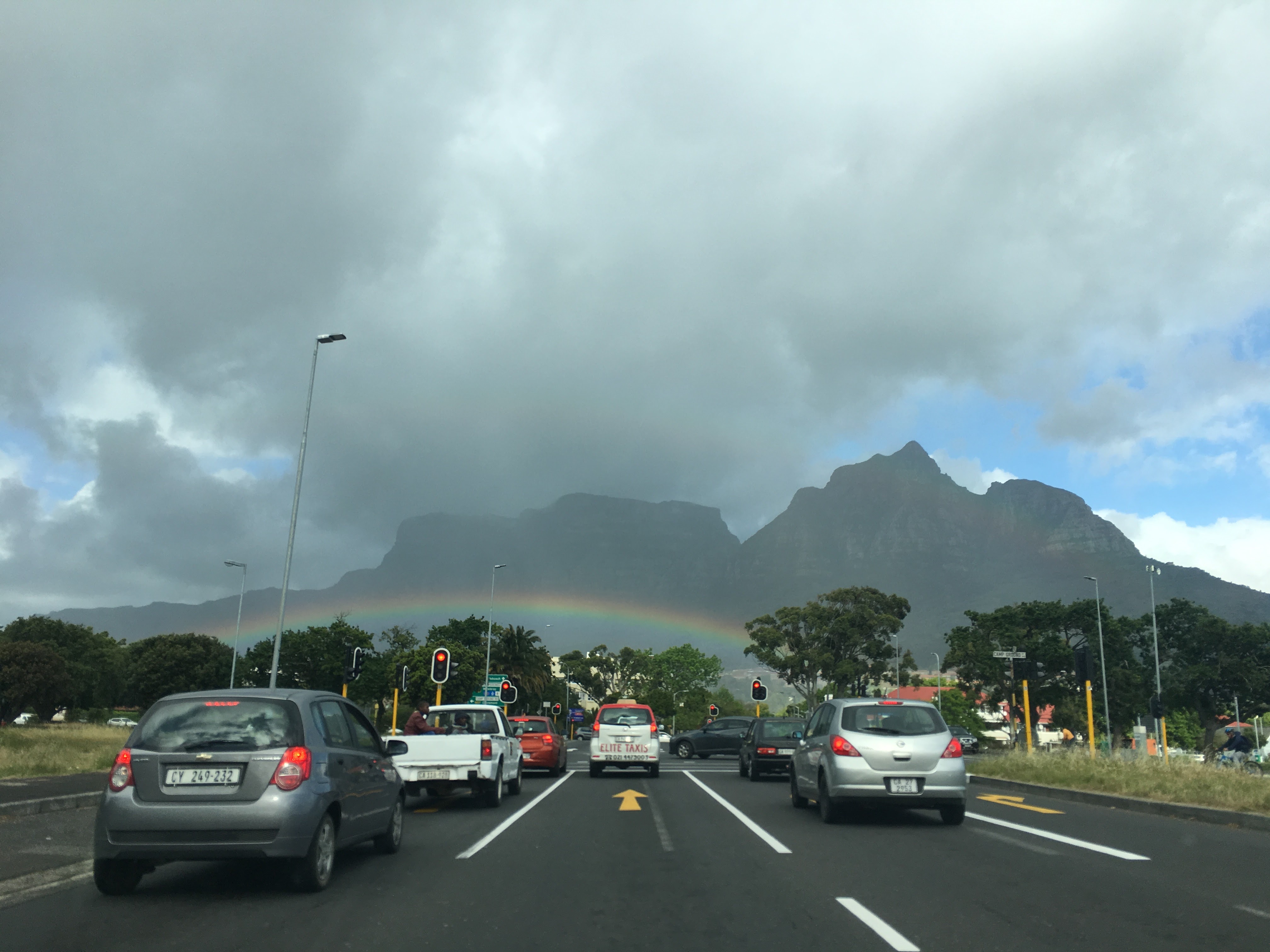 Image was taken last year while I was driving. The rainbow sat almost perfectly between my apartment and UCT. What’s also interesting is that the rain cloud was exclusively over Rondebosch, with the sky behind me and towards the harbour (on the right) being almost completely clear 🙂