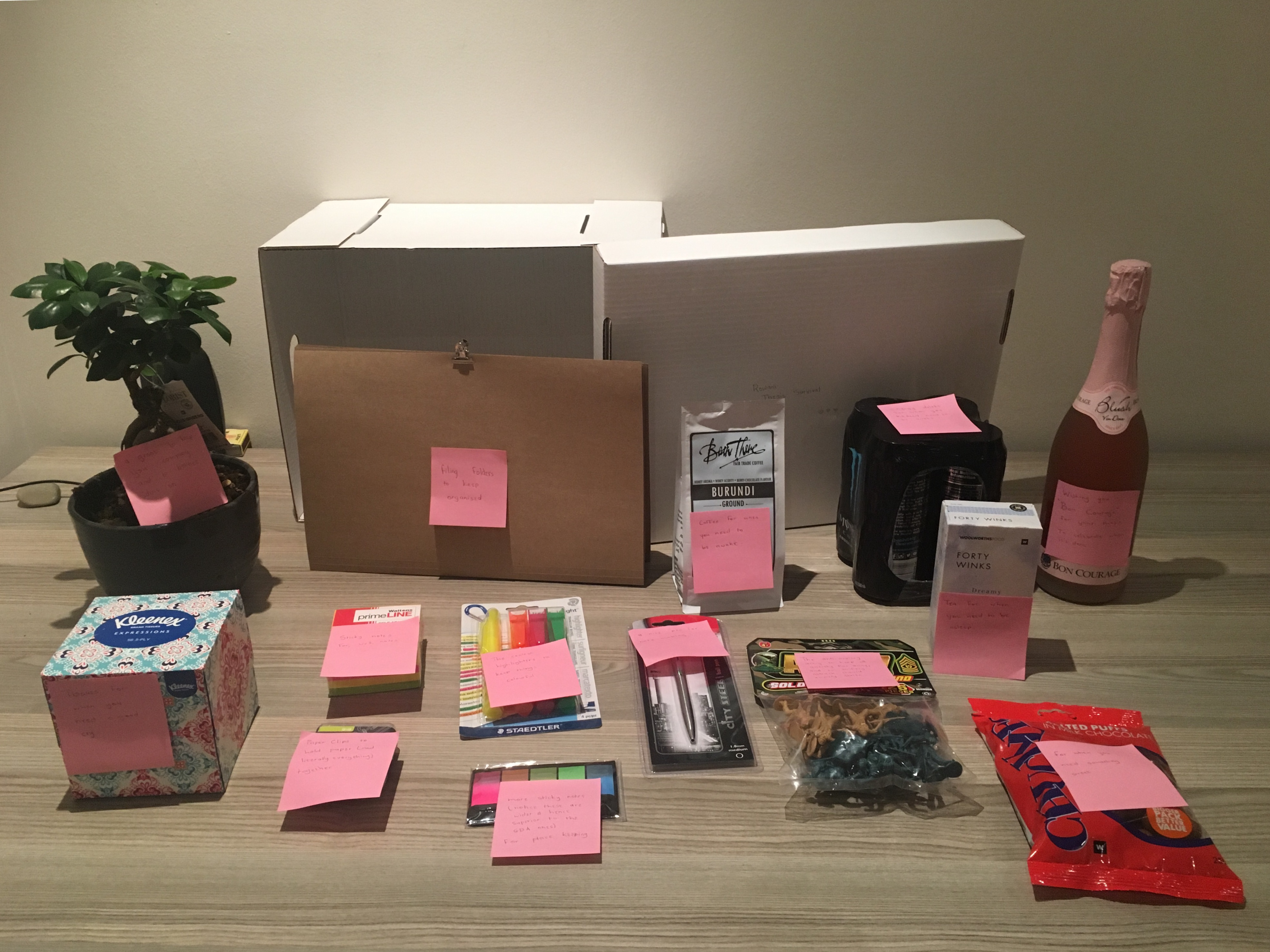 Image is of the care pack that Kayleen got me for the start of my thesising. It includes everything from stationery to emergency chocolates and a tissues to bubbly to pop when I hand in 🙂 Thanks Kay!